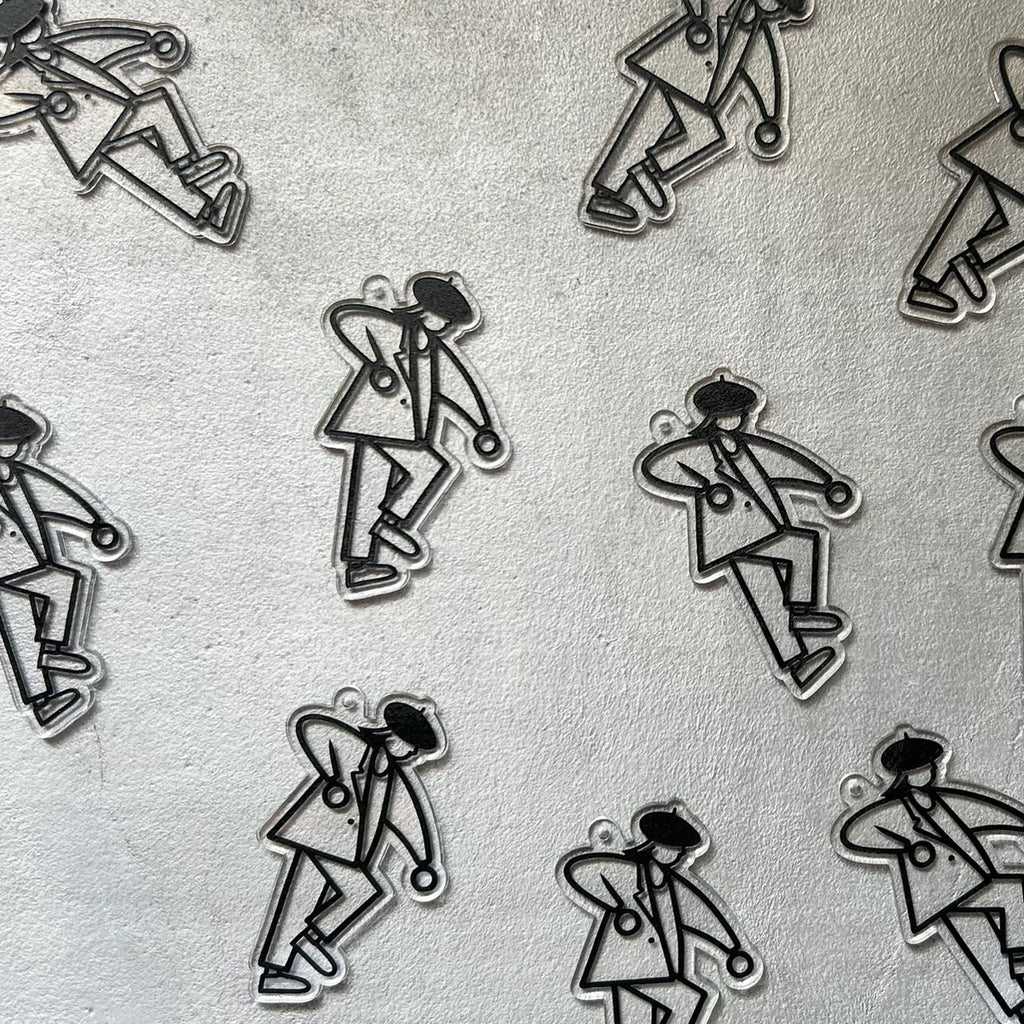 透明の2.5mmアクリル板を使って"HEADS MAN"本体が踊るように揺れてる感じにもう一枚の板にHEADSのLOGOとJust dance your own way. (自分の踊り方で良いんだよ)のメッセージを載せたキーホルダー。